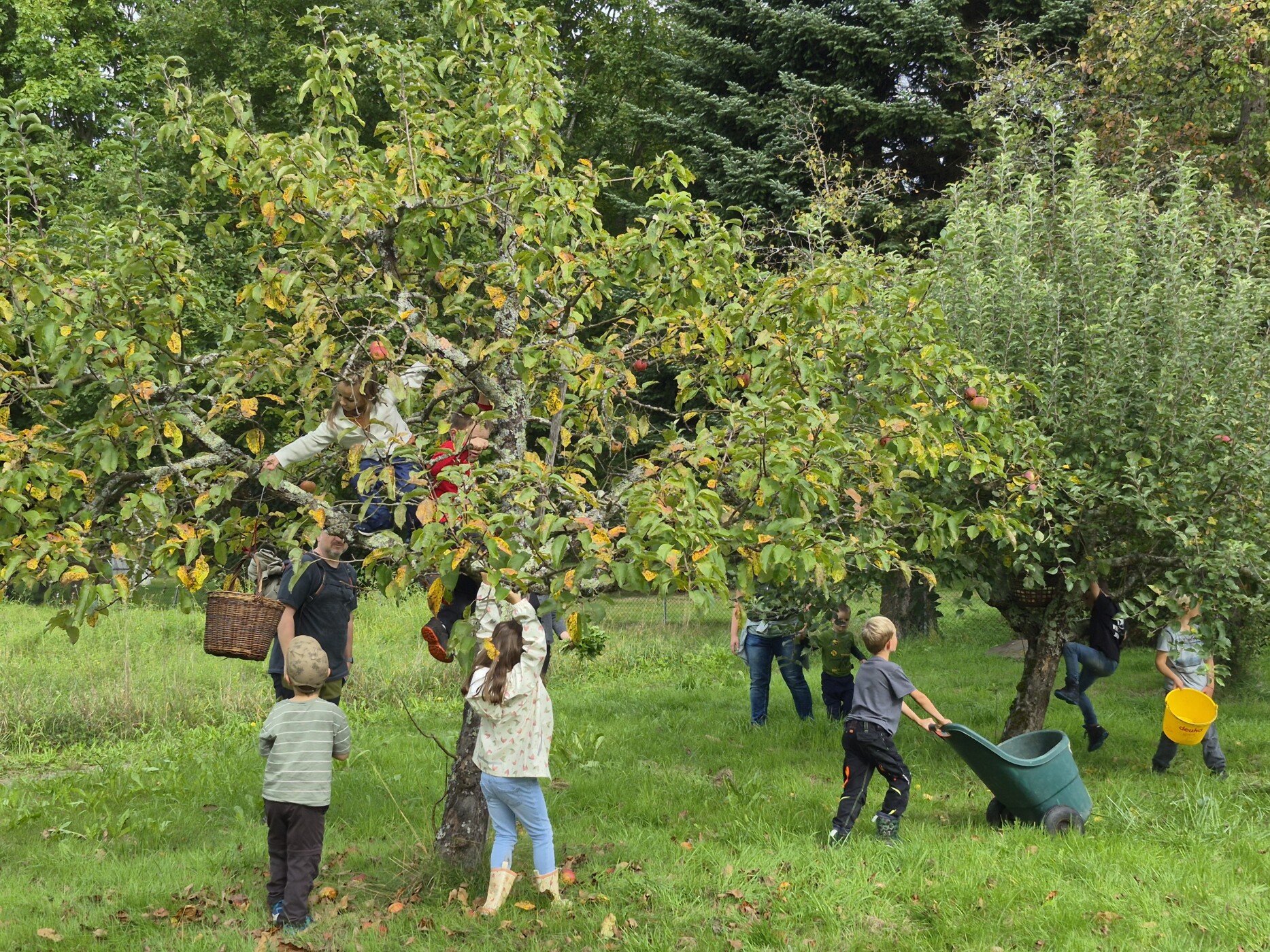 Bei bestem Wanderwetter haben sich sind 27 Teilnehmer eingefunden zur Familienwanderung des Schwarzwaldvereins Zell. Nach einer einstündigen gemütlichen Wanderung erreichten wir die Streuobstwiese mit ca.40 Bäumen mit ca 10 verschiedenen Sorten, wie Pilotapfel, Cox Orange, Goldparmänen, Boskop, Jonathan usw. Auf Streuobstwiesen gibt es nicht nur Äpfel, sondern auch jeder Menge Lebewesen. So hat Marlon Pioggio den 16 Kindern nahegebracht, was da alles kriecht, krabbelt und fliegt. Eine seltene Goldwespe hat in einem alten Ast eines Baumes eine Brutstätte. Auch einheimische Hornissen haben sich in einem Vogelhaus eingenistet. Dass Wühlmäuse die größte Gefahr für junge Bäume sind, ist für den Besitzen der Wiese sehr ärgerlich.