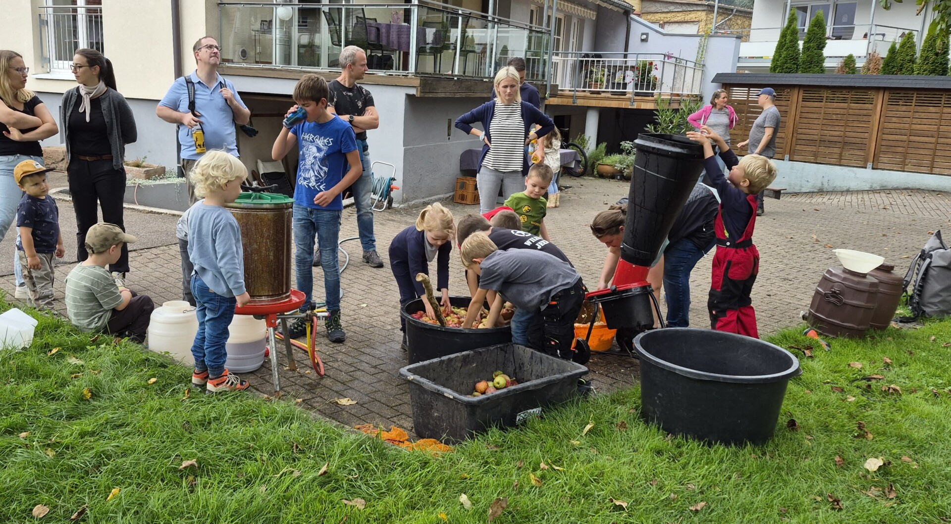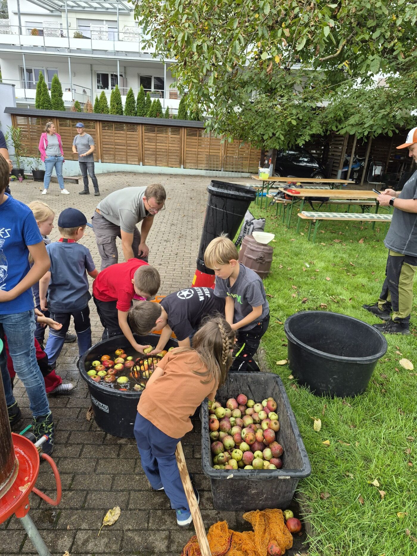 Das Ziel war jedoch, mit den Kindern die Äpfel zu pflücken und zu Saft zu pressen. Mit Begeisterung wurden von den Kindern die Äpfel gewaschen und in den Muser geworfen, in dem sie zerkleinert wurden. Danach wurden die gemahlenen Äpfel in der kleinen Hydraulischen Obstpresse zu frischem Apfelsaft gepresst. Nach getaner Arbeit wurde mit einem Datschkuchen zusammen der frisch gepresste Saft getrunken.